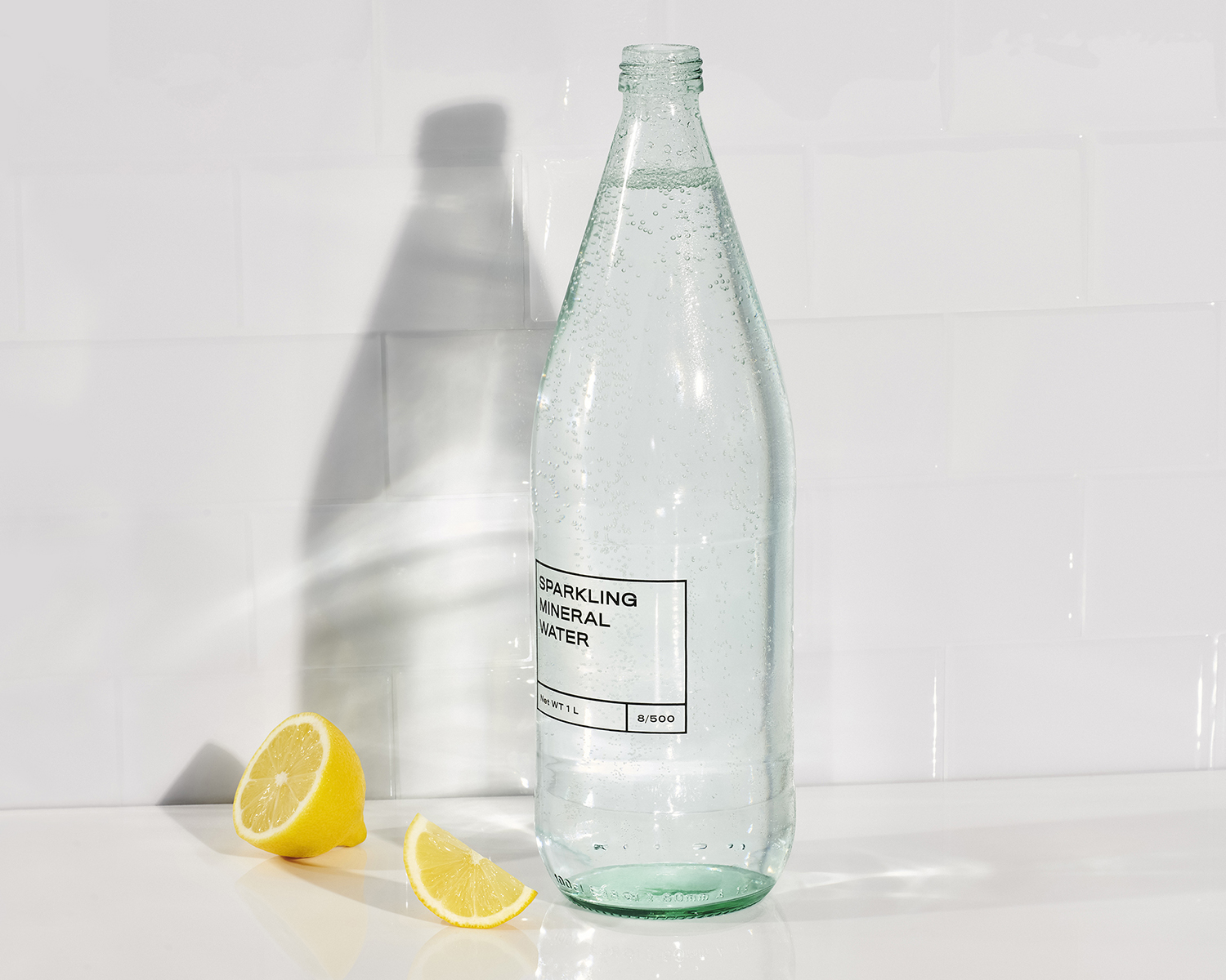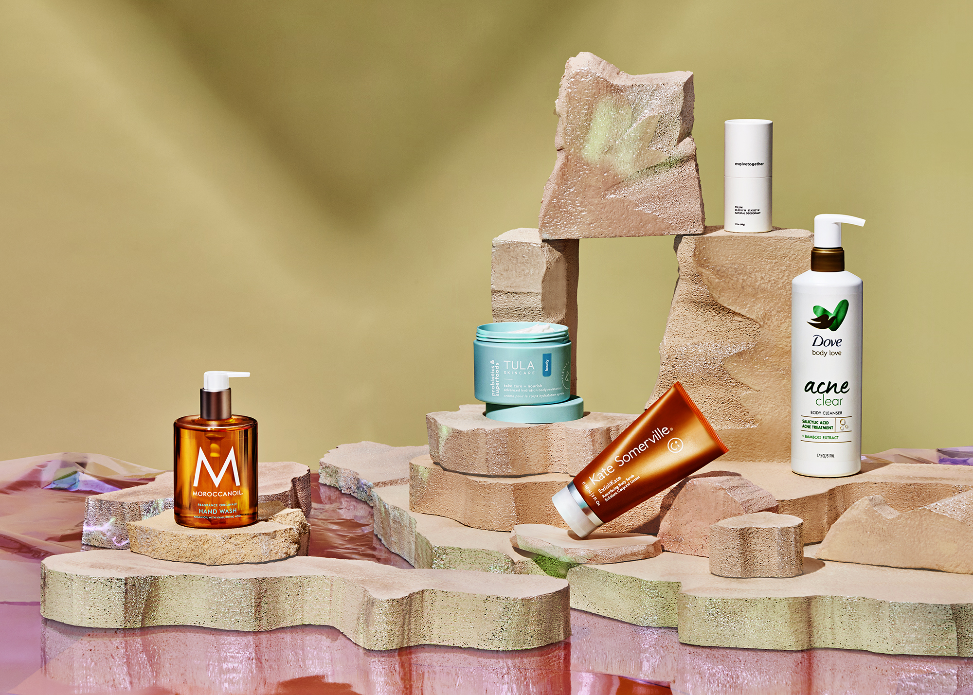 Custom plexi tiles, layered grids, and soapy suds highlight hero products in a clean, textural environment.