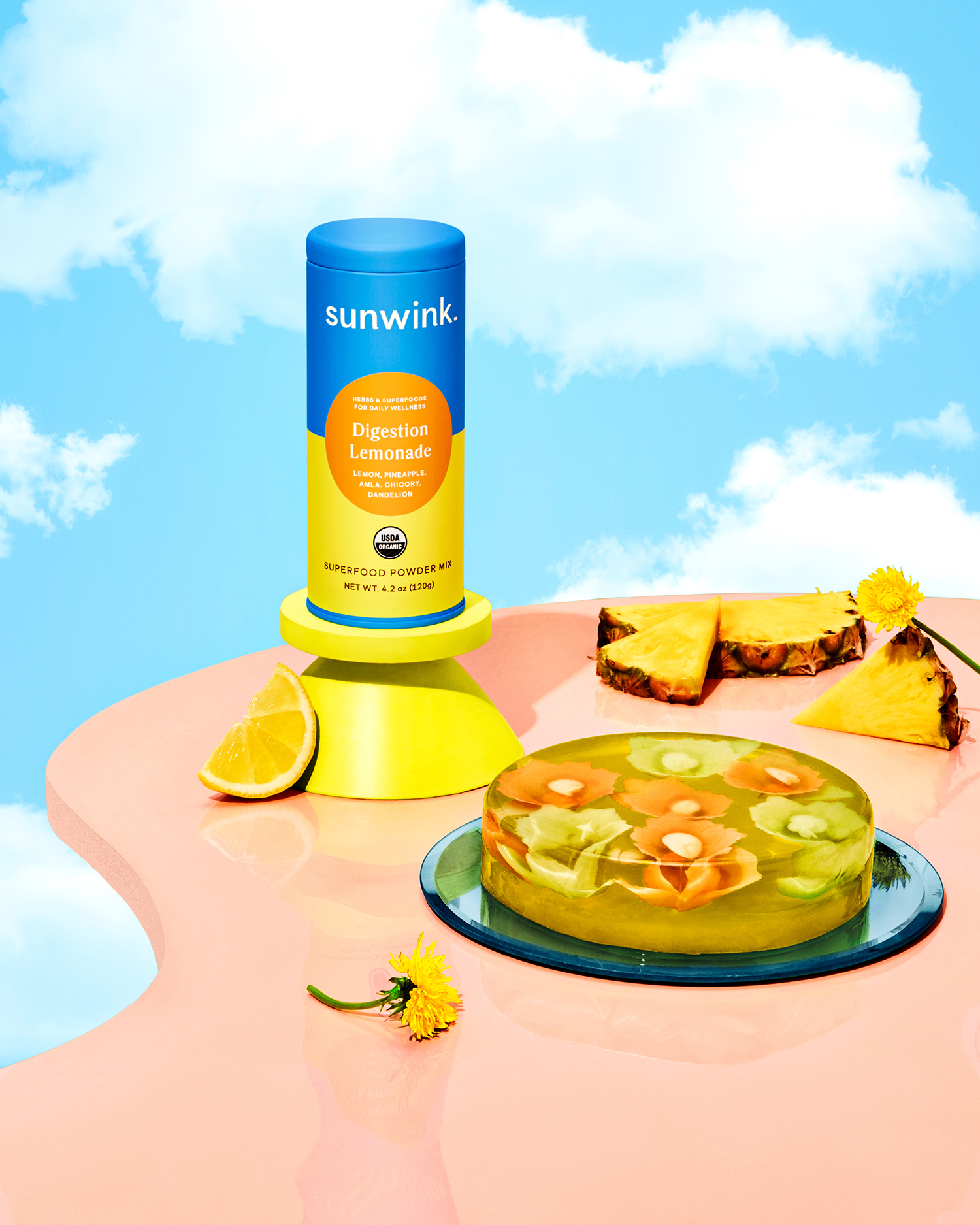 Colorful, refreshing visuals for Sunwink’s new superfood flavors—Digestion Lemonade and Beauty Fruit Punch—featuring hero shots, ingredient images, and recipe images.