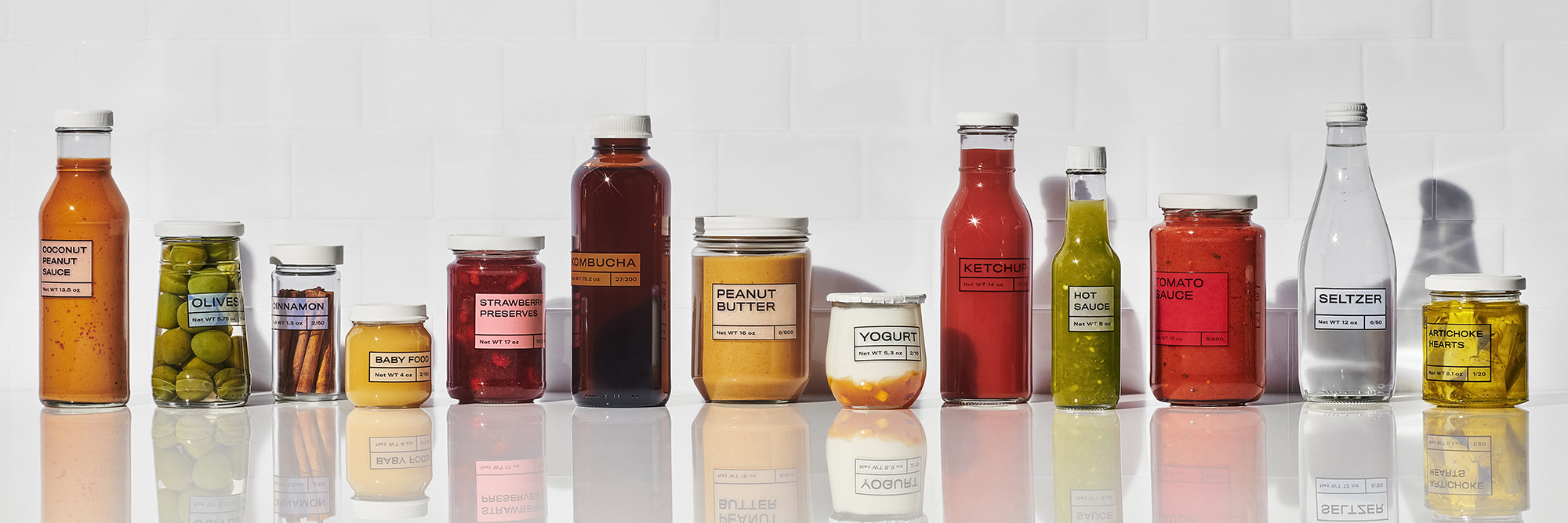 Clean and simple images for O/I—one of the leading glass manufacturers in the world—showcasing the availability (and benefits!) of glass packaging over plastic when shopping for everyday household food items.