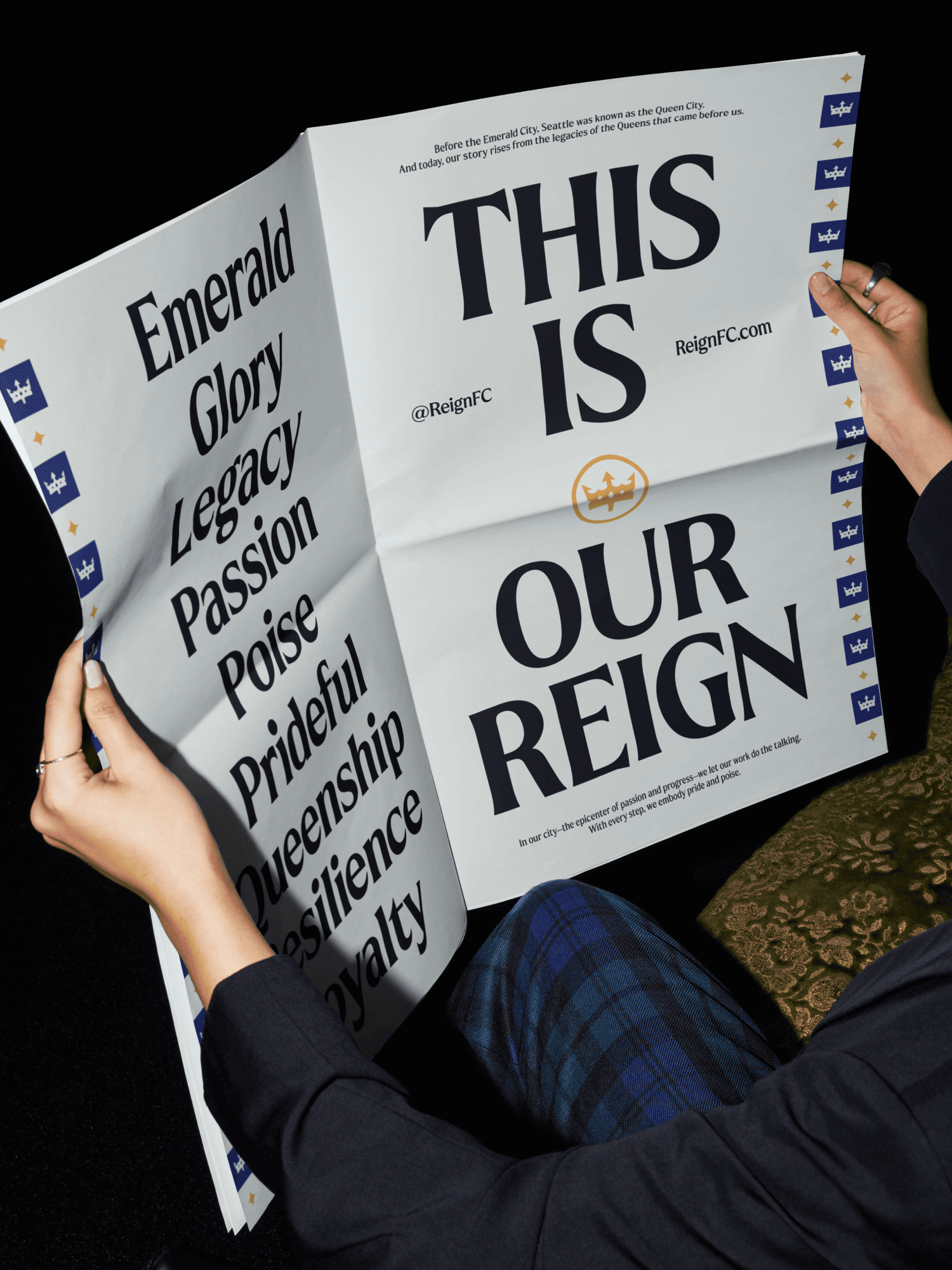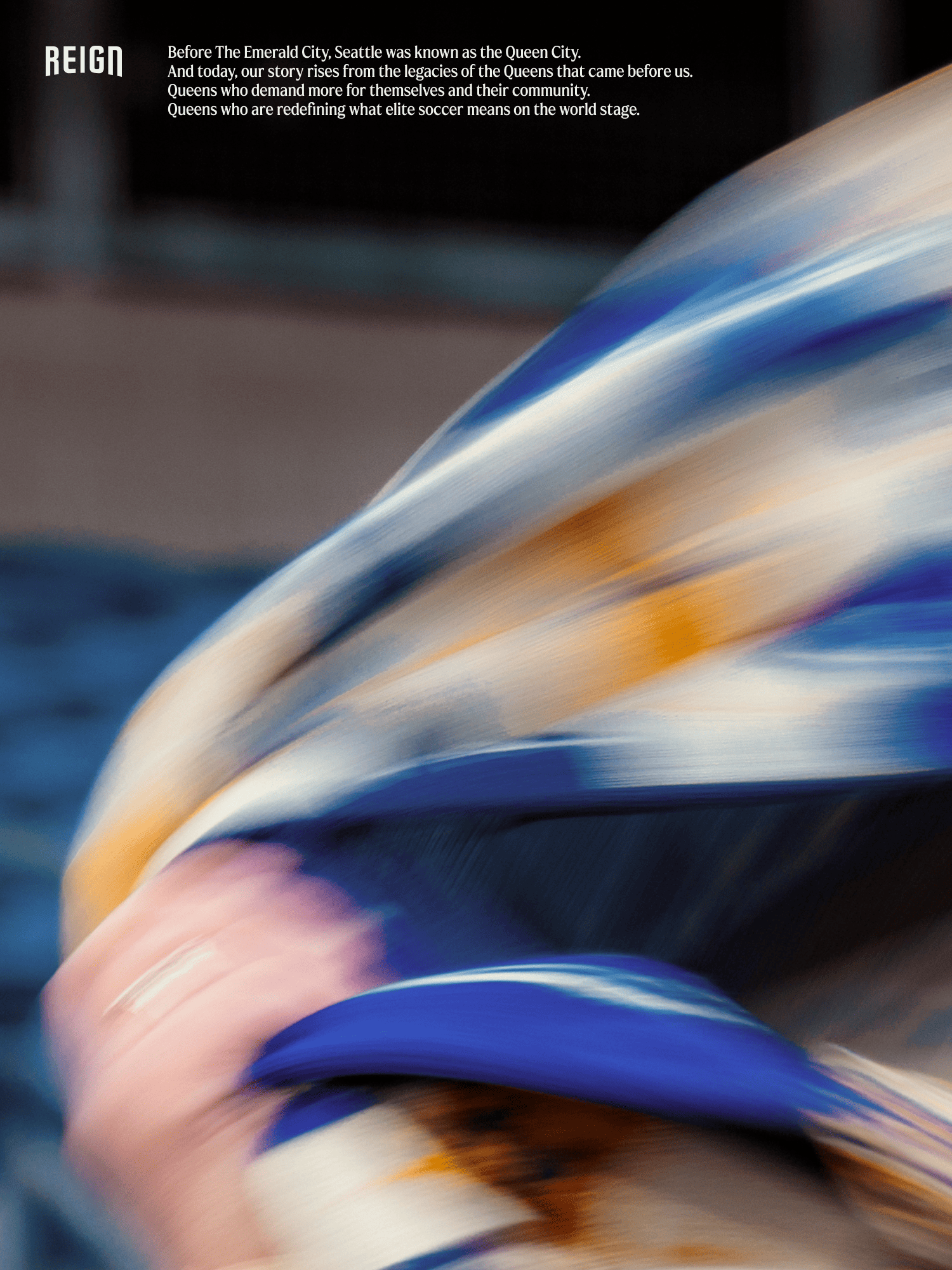 Guided by the Queen’s posture, we reimagined Reign’s identity to reflect her power and grace. We crafted a distinct typographic voice that blends elegance with unshakable strength. That same ethos carries through to our photography, capturing players as poised, unstoppable forces. Each element is grounded with a refined color palette that channels the vibrancy of Seattle’s landscape and mirrors the team’s excellence, on and off the pitch.
